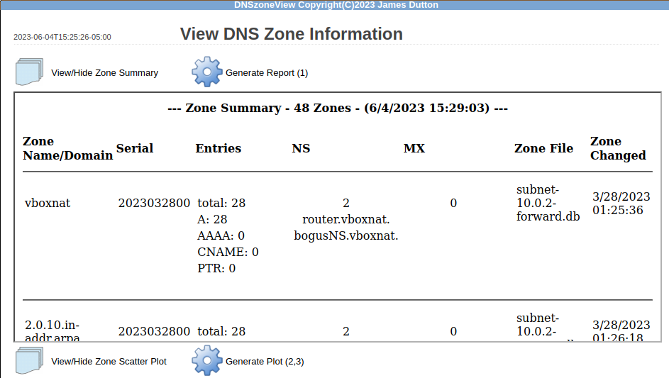 - Provides a Zone Summary of RR record counts, file dates, sizes, etc. in a scrollable frame