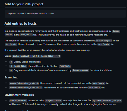 Running a DNS service for docker containers always messes with the DNS settings of your workstation. Especially if these DNS/discovery services themselves run inside docker containers on an active development workstation. Resolving DNS issues is not an easy task. Contrary to that the hosts file is simple. The script first removes all existing entries of all the hostnames of containers created by docker-compose. Configure the environment variables in your .env file. That way it can be used by docker-compose as well (DRY).