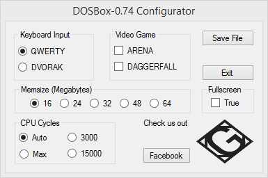 This program allows you to easily configure DOSBox to make it easier to play. It's main feature is to autoplay TES Arena and TES Daggerfall, and it gives the user the ability to choose either game to autoplay or no game, granted that the games are installed in the correct location (specified in the ReadMe). You can easily change the memsize, cpu cycle speed, keyboard input, and choose whether or not to launch DOSBox in fullscreen mode. All of this in one location, which can be placed on your desktop.