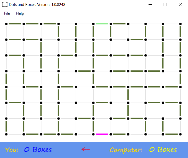 You and the computer take turns to place a line between to adjacent dots trying to form a box (by joining 4 dots with lines).