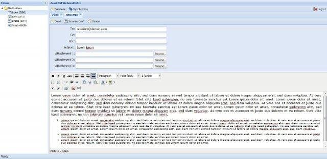 dracMail is a webmail interface built using PHP, ExtJS (JavaScript framework), MySQL and IMAP. Features include: Rich UI, WYSIWYG editor, HTML mail composing and message caching.