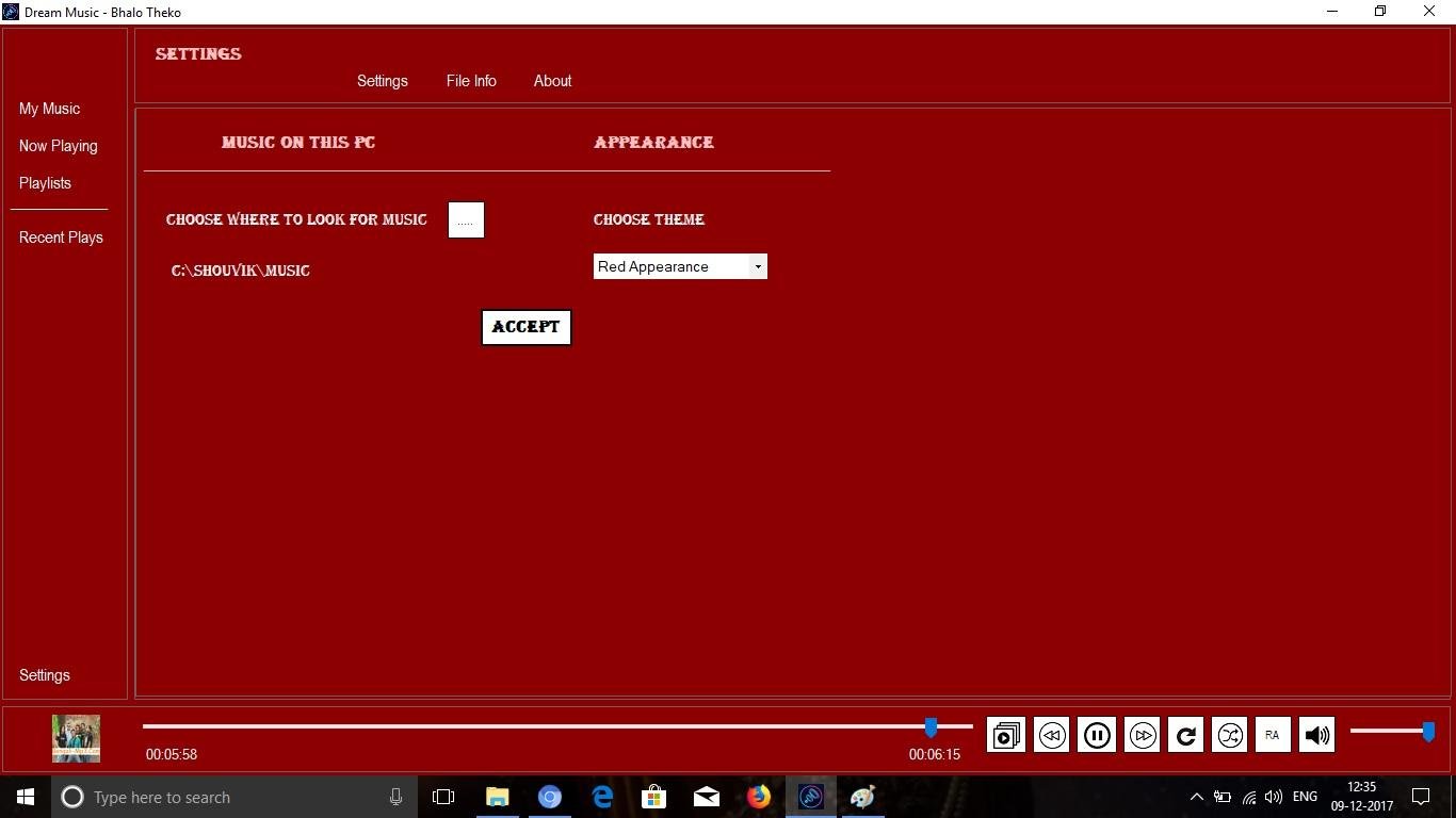 Dream Music Player is a very good application for playing audio files on a desktop with support to a wide variety of audio formats. It has full functionality with playlist, shuffle, open folder, repeat and so on. One can also load his music library with just a click. And most of all its interface is pleasing. Looking for new apps can give it a try. Current version is 3.0. The next version is planned to having audio streaming online feature.