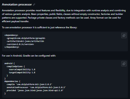 Fastest JVM (Java/Android/Scala/Kotlin) JSON library with advanced compile-time data binding support. Java JSON library designed for performance. Originally built for invasive software composition with DSL Platform compiler. v1 core library was targeting Java6, while v2 targets Java8. So there is no need anymore for dsl-json-java8 project and instead, just dsl-json project should be referenced. From v2 only a single annotation processor is supported, which was previously in the java8 project. Joda and some other specific libraries were removed. If you still need converters for those types, you need to include them in your project.