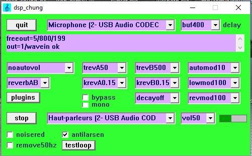 dsp chung is an universal dsp sound effects program for your computer .Chooze the input sound port (for example the line in entry of an external usb sound card) then dsp effects (autovol/compressor , reverb, automodulation, decay, plugins,denoise) will be applied and sent to the selected output sound port (for example the system mixer) . The program is written in compiled freebasic , source code is included in the zip file .
