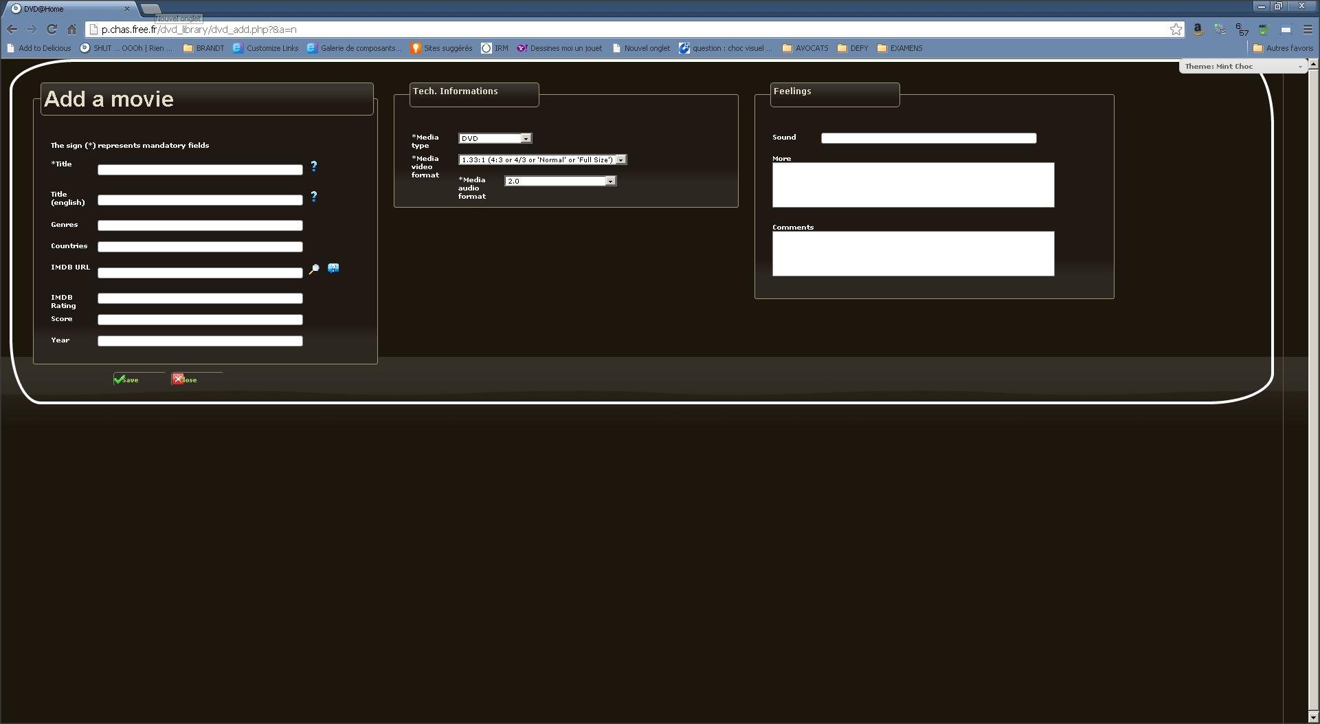 Your movies (DVD & more) library ... Using LAMP (PHP/MySQL) and a web user interface. Can retrieves IMDB datas from english title or your language title ... Multiple browsers support. jQuery improvements.