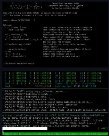 The Deduplicating Warp-speed Advanced Read-only File System. A fast high compression read-only file system for Linux and Windows. DwarFS is a read-only file system with a focus on achieving very high compression ratios in particular for very redundant data. This probably doesn't sound very exciting, because if it's redundant, it should compress well. However, I found that other read-only, compressed file systems don't do a very good job at making use of this redundancy. See here for a comparison with other compressed file systems. DwarFS also doesn't compromise on speed and for my use cases, I've found it to be on par with or perform better than SquashFS. For my primary use case, DwarFS compression is an order of magnitude better than SquashFS compression, it's 6 times faster to build the file system, it's typically faster to access files on DwarFS and it uses less CPU resources.