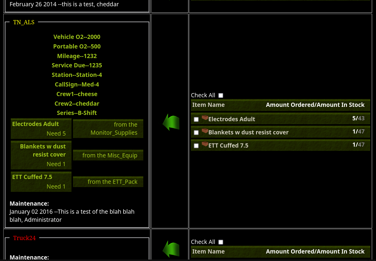 This is an EMS and firefighters inventory web page. Easily check inventory on apparatus used in the emergency medical field. Track expiration dates throughout your service. Seal scheduled medications with accountability.