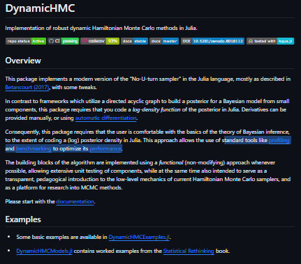 Implementation of robust dynamic Hamiltonian Monte Carlo methods in Julia. In contrast to frameworks that utilize a directed acyclic graph to build a posterior for a Bayesian model from small components, this package requires that you code a log-density function of the posterior in Julia. Derivatives can be provided manually, or using automatic differentiation. Consequently, this package requires that the user is comfortable with the basics of the theory of Bayesian inference, to the extent of coding a (log) posterior density in Julia. This approach allows the use of standard tools like profiling and benchmarking to optimize its performance.