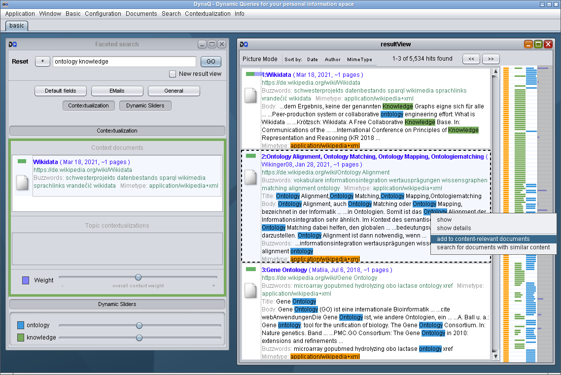The goal of DynaQ is to develop an inquiry system to explore the personal information space, supporting you with the searching paradigm 'orienteering'. DynaQ is a (desktop)search engine with enhanced functionality for file, email and blog search.