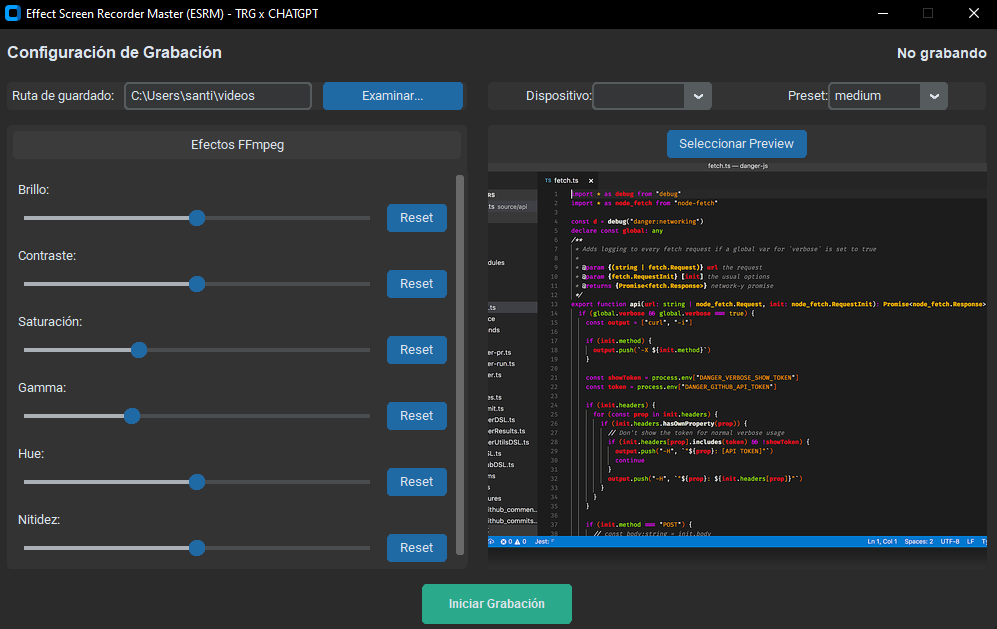 ESRM es un programa para grabación de pantalla con efectos visuales en tiempo real, hecho 100% con chat GPT, está escrito en python y con interfaz gráfica en Custom Tkinter, se usa FFMPEG para realizar las grabaciones (en cualquier caso, debe instalar FFMPEG y añadirlo al PATH).