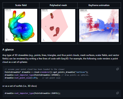 Easy3D is a lightweight, easy-to-use, and efficient library for processing and rendering 3D data, implemented in C++ with Python bindings. It is designed for tasks such as 3D modeling, geometry processing, and rendering, emphasizing simplicity and efficiency. Easy3D serves as a valuable tool for research, education, and the development of sophisticated 3D applications, providing a solid foundation for handling 3D data.