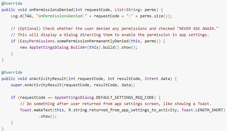 EasyPermissions is a wrapper library to simplify basic system permissions logic when targeting Android M or higher. If your app is written in Kotlin consider the easypermissions-ktx library which adds Kotlin extensions to the core EasyPermissions library. To begin using EasyPermissions, have your Activity (or Fragment) override the onRequestPermissionsResult method. If all of the permissions in a given request are granted, all methods annotated with the proper request code will be executed(be sure to have an unique request code). The annotated method needs to be void and without input parameters (instead, you can use onSaveInstanceState in order to keep the state of your suppressed parameters). This is to simplify the common flow of needing to run the requesting method after all of its permissions have been granted. Optionally, for a finer control, you can have your Activity / Fragment implement the PermissionCallbacks interface.