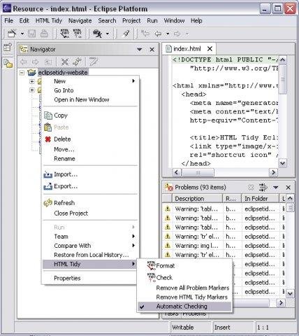 Eclipse plugin based on JTidy, the Java port of HTML Tidy. For (X)HTML and XML files, it provides a Validator (Manual or automatic checking) and a Formatter based on numerous preferences.