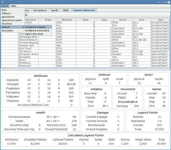 The Earthdawn Character Editor is a java-based utility to create and manage character for the role-playing game Earthdawn Third Edition and for the role-playing game Earthdawn Forth Edition. It is intend to be very flexible, so almost the full behaviour can be configured through xml-based config-files. Multi language support is possible.