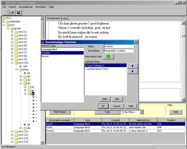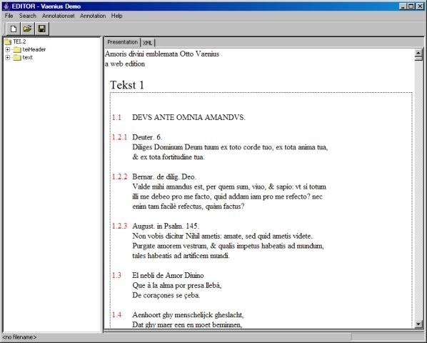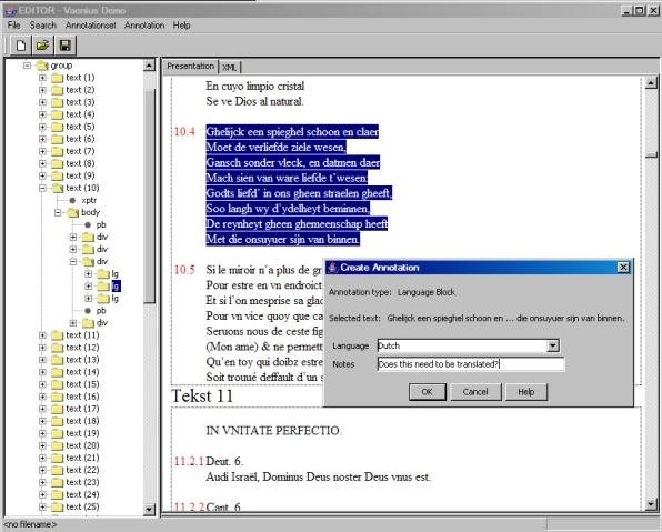 Editor is an annotation tool for XML-based text editions. Editor is meant to support research into any aspect of the edited texts. It should be useful to literary, linguistic, historical, (etc.) research.