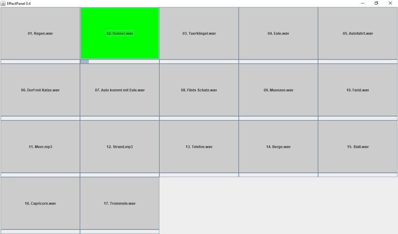 Theater Effect Panel (EffectPanel) is a small open source software to play sounds on live performances. You can use this program for free and it can be used with a mouse, a touch panel or over a midi interface with a keyboard or a button pad.