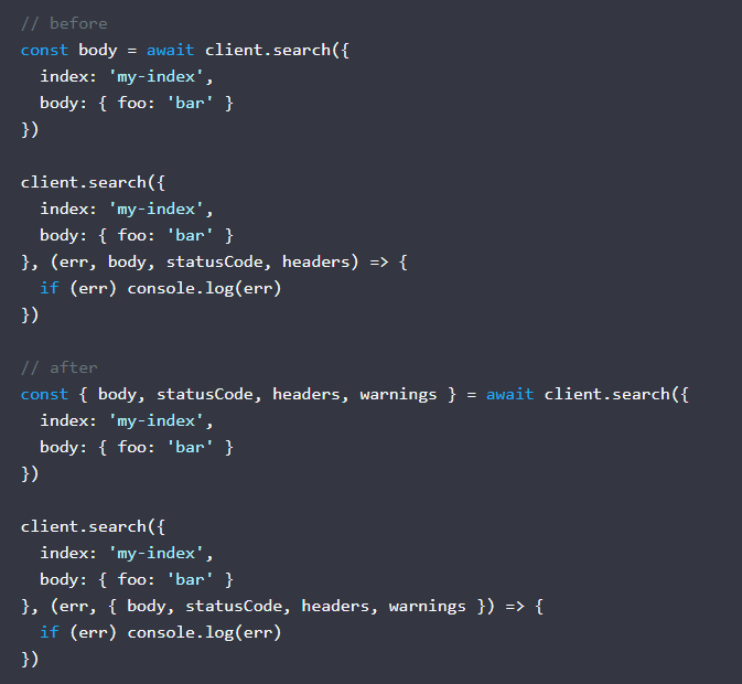 Node.js client for Elasticsearch. The client versioning follows the Elastic Stack versioning, this means that major, minor, and patch releases are done following a precise schedule that often does not coincide with the Node.js release times. Language clients are forward compatible; meaning that clients support communicating with greater or equal minor versions of Elasticsearch. Elasticsearch language clients are only backwards compatible with default distributions and without guarantees made. If you are using multiple versions of Elasticsearch, you need to use multiple versions of the client. In the past, install multiple versions of the same package was not possible, but with npm v6.9, you can do that via aliasing. You will require the packages from your code by using the alias you have defined.