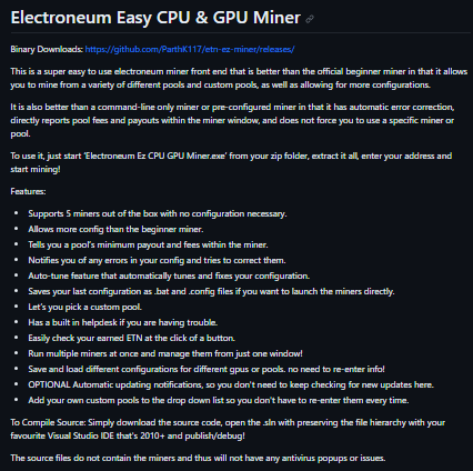 This is a super easy-to-use electroneum miner front end that is better than the official beginner miner in that it allows you to mine from a variety of different pools and custom pools, as well as allowing for more configurations. It is also better than a command-line-only miner or pre-configured miner in that it has automatic error correction, directly reports pool fees and payouts within the miner window, and does not force you to use a specific miner or pool.