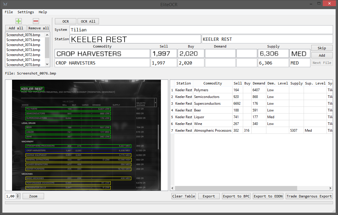 EliteOCR allows you to OCR market screenshots from Elite: Dangerous and export the data to various formats and services.