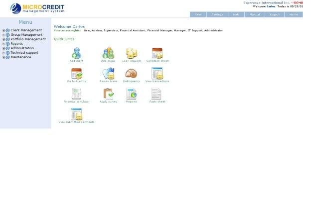 EMMS is a web based microcredit management information system based on PHP5/PEAR and MySQL5. It provides the key functionality required by MFIs, including client and loan portfolio management,loan repayment tracking, reporting and tools for social impact