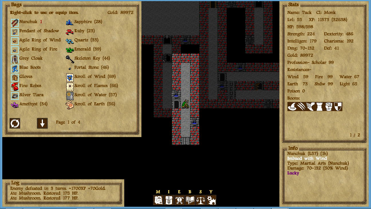This game differs from a lot of other roguelikes in that it's largely GUI- and menu based (similar to old console RPGs) and has turn-based battles.