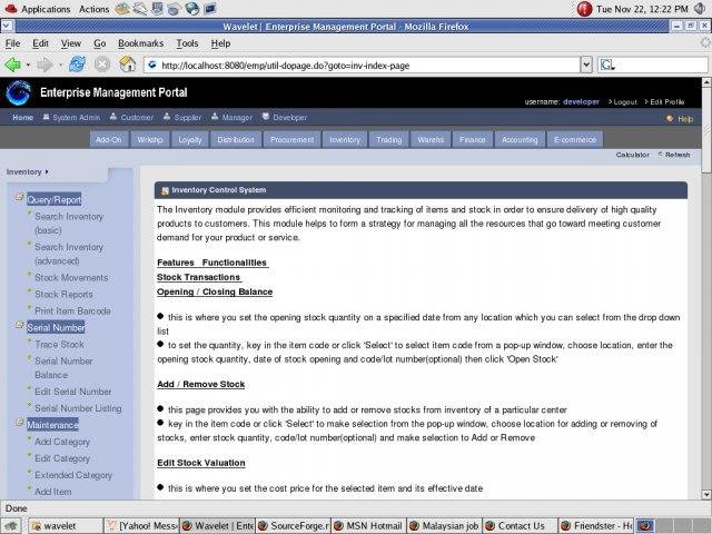Wavelet EMP is a web-based J2EE ERP system running on PostgreSQL DB. It is in production status and used by more than 100 shops in South Eash Asia. The software team is in Malaysia. Powered by WAVELET.BIZ. For demo/help, email vincent@wavelet.biz