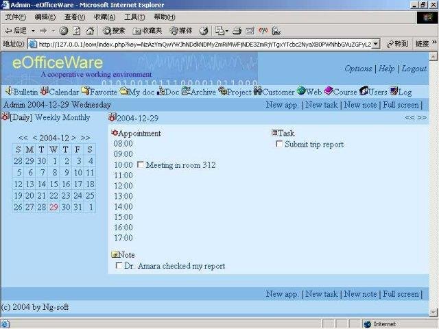 eOfficeWare is a multi-user, web-based groupware suite developed using PHP. Currently available modules include: bulletin, calendar, doc, project, customer, web, course, and users. It is module based and it's easy to develop more modules.