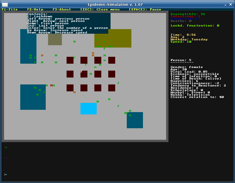 This software is very new and will be updated from time to time. Currently people can die from the virus or from suicide when they got too unhappy. Lockdowns, social isolation, being close to somebody who died and being sick makes unhappy. Being close to other (living) people makes happy (human relation). The satistics currently include number of: susceptible, infectious, recovered, deaths; total happiness and happiness of single persons. Acceptance of lockdowns depends on personality and decreases with time.