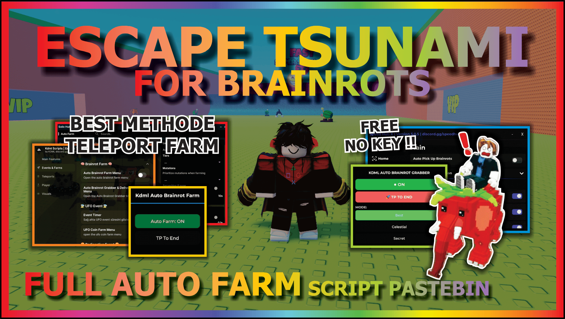 - Looking for the best Escape Tsunami For Brainrots Script (No Key)? This NEW 2026 updated script includes Auto Farm, TP To End, Auto Collect Brainrots, Dupe Glitch, Speed Bypass, Infinite Jump, Fly, God Mode, and more! Works on Mobile and PC with no key system required.