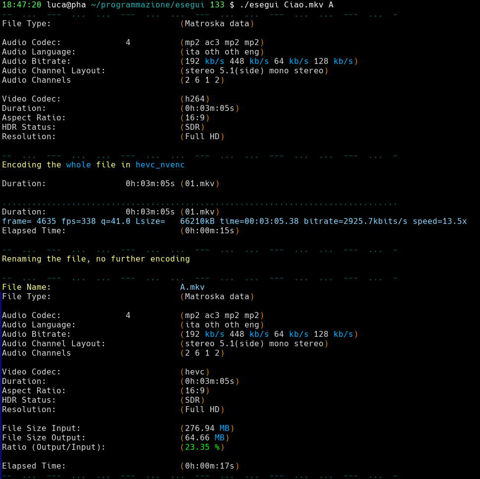This bash script streamlines video encoding and processing by leveraging FFmpeg. It supports a wide range of formats and codecs through FFmpeg, including MKV, MP4, x264, x265, AV1 and VP9. Key features include:
