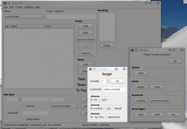 Estes is an open source restaurant POS. Contains module for coworking with kitchen - orders are transferred to kitchen for preparing.