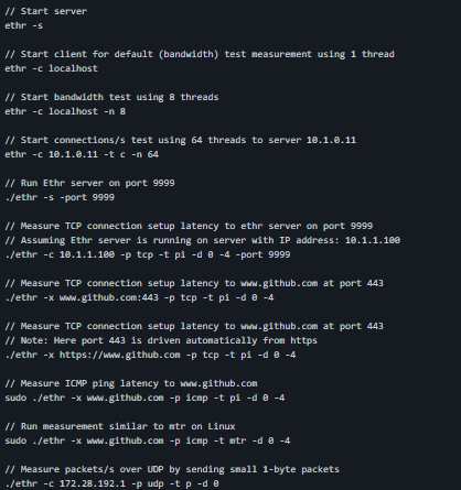 Ethr is a cross-platform network performance measurement tool written in golang. The goal of this project is to provide a native tool for comprehensive network performance measurements of bandwidth, connections/s, packets/s, latency, loss & jitter, across multiple protocols such as TCP, UDP, HTTP, HTTPS, and across multiple platforms such as Windows, Linux and other Unix systems. Ethr takes inspiration from existing open-source network performance tools and builds upon those ideas. For Bandwidth measurement, it is similar to iPerf3, for TCP & UDP traffic. iPerf3 has many more options for doing such as throttled testing, richer feature set, while Ethr has support for multiple threads, which allows it to scale to 1024 or even higher number of connections, multiple clients communication to a single server etc. For latency measurements, it is similar to latte on Windows or sockperf on Linux.