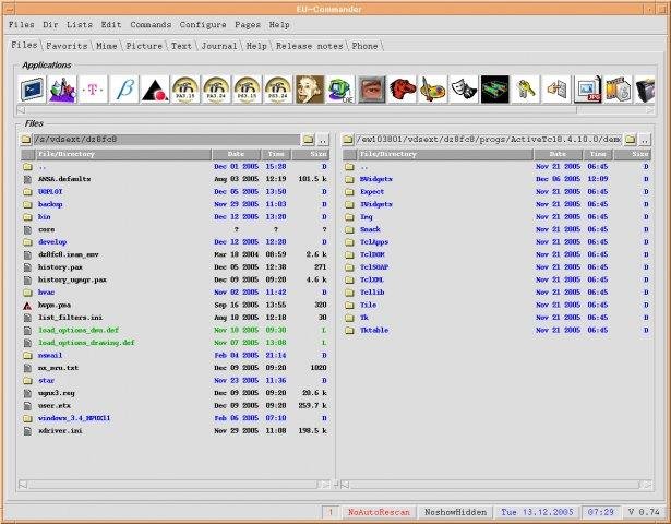 EU-Commander is an Tcl/Tk based file manager (WinCommander like) with applications bar, favorites, mime types. Additional modules (e.g. text/picture viewer/editor) and some more are included in the package. Easy implementation of own Tcl/Tk modules.