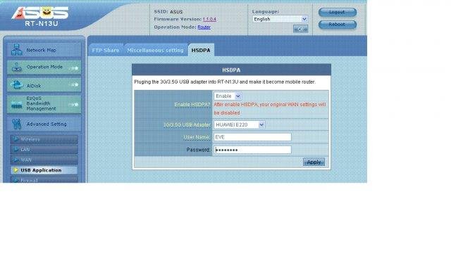 Add 3.5G USB dongle support on ASUS RT-N13U The RT-N13U UI is good enough, so I don't change much. Only add 3.5G setting in advance setting--> USB Application This FW supports HUAWEI E169 E220, Bandluxe C270, OPTION 225 now.