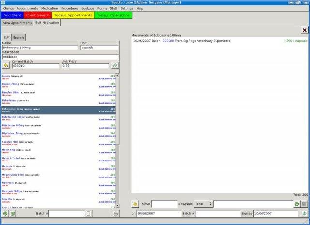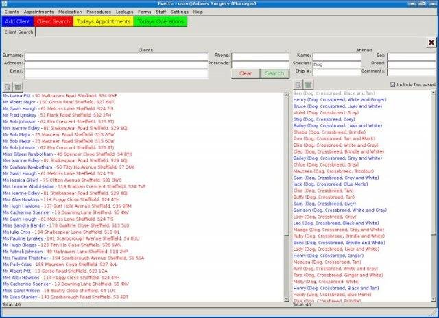 Animal Clinic or Veterinary practice management. Stores and manipulates clients, animals, appointments, operations, medication, procedures. Generates bills, receipts and forms and tracks batch numbers. Fully network compatible.