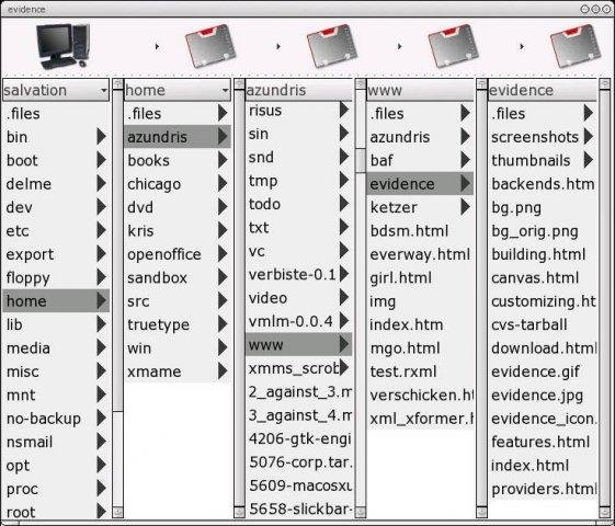 GTK2/enlightenment file-manager. Browser-view a la NeXT/Step, Icon-/thumbnails-view a la efm. Fully themable. Microshell. Themes, thumbnailers and metadata providers (MP3/ID3, Ogg, EXIF, ...) are plugins -- you don't load what you don't need, no bloat.