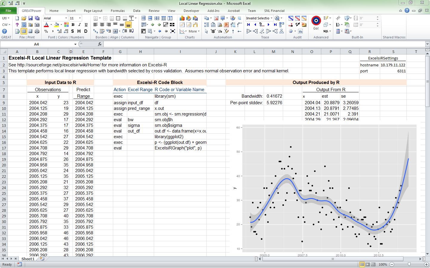 Excelsi-R is an Excel add-in that allows Excel spreadsheets to harness the power of the R statistical language by connecting to a running R process. R does not need to be installed on the computer running Excel, but it does require access to an R instance running Rserve (which can be on a remote computer).