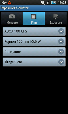 Convert the light measured using a digital camera (aperture, speed and iso) to use on a view camera (taking in account film non-reciprocity, filter and bellow extension) on android phone.