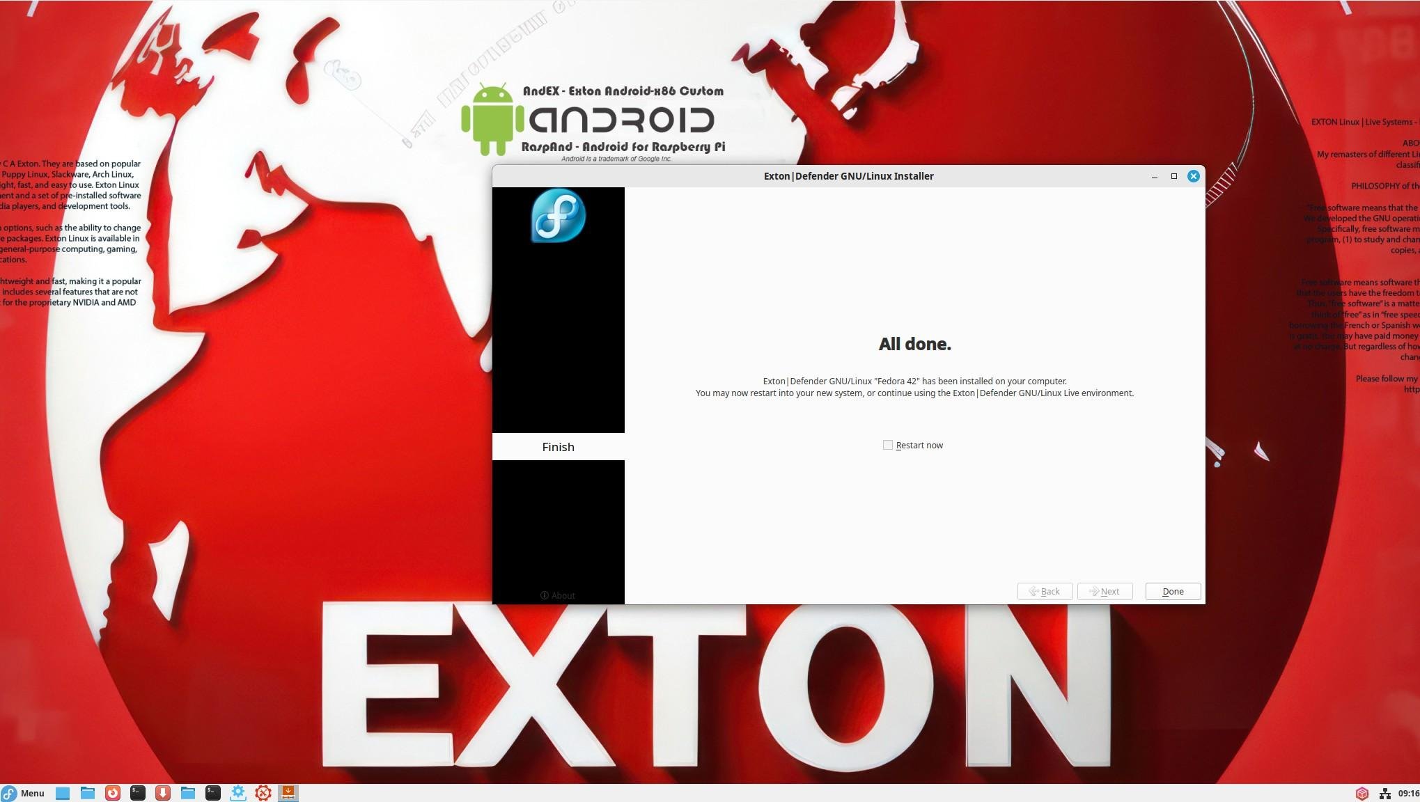 Exton|Defender (three versions) is based on Fedora 42 (stable), Fedora "rawhide" and Rocky Linux 9.2 respectively.