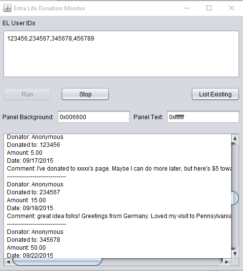 Intended to be used during a live stream, this parser will poll for new donations based on a comma-delimited list of ids and display them in a frameless background with a total. Colors can be changed without closing the display to support streamers using a chroma key.