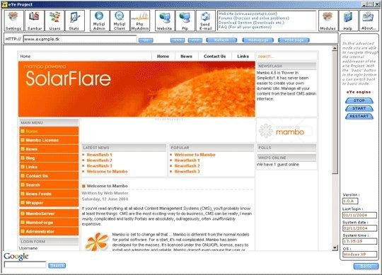eYe Project is a distribution of Sambar Webserver, MySql database and PhP in a Windows enviroment. Complete configured, ready to use. There are also lots of modules available for use in this project. The concept is to setup a complete web-database server