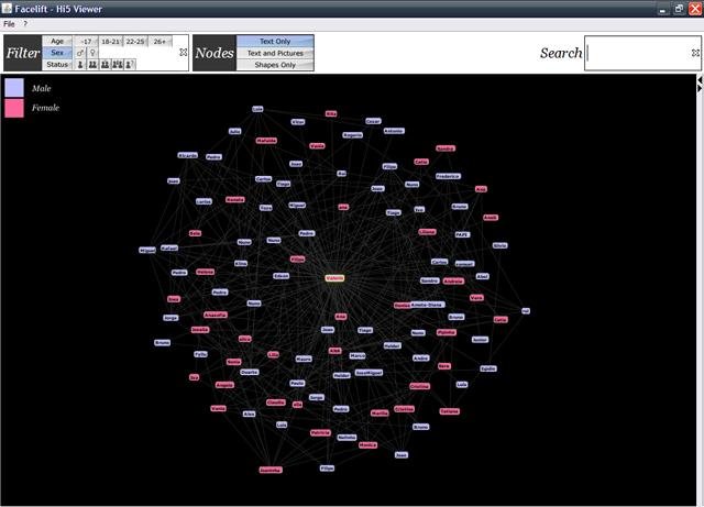 Facelift is a visualization and analysis software for online social networking services. It displays a given community as a node-link diagram and provides several search / filtering functions as well as cluster analysis features.