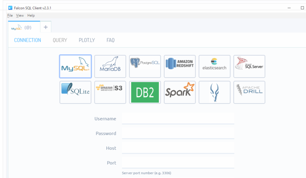 - Falcon supports connections to RedShift, MySQL, PostgreSQL, IBM DB2, Impala, MS SQL, and SQLite