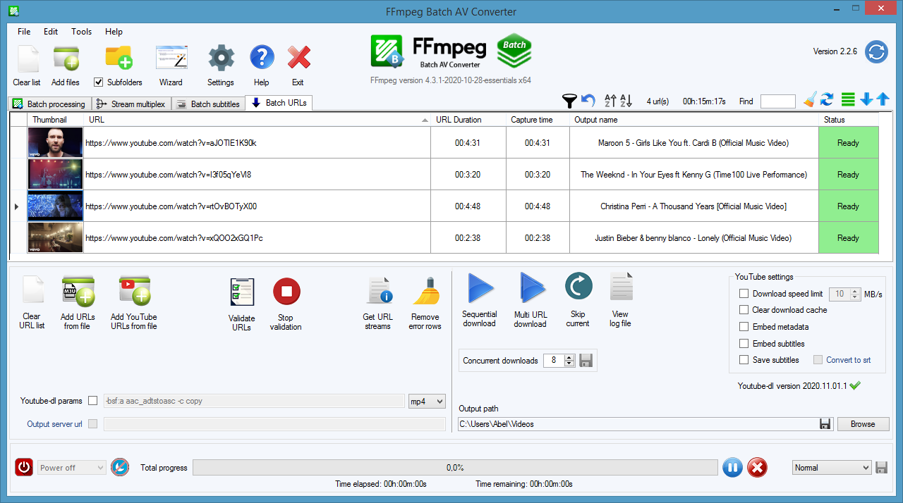 It provides unlimited single or multi-file batch encoding for almost any audio/video format. You can use any set of parameters and try them before starting encoding. You can multiplex streams, subtitle videos (as track and hardcoded), trim, concatenate, record screen, multimedia info. Included youtube-dl / yt-dlp frontend GUI to download urls.