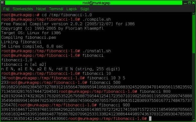 Fibonacci, to unix shell. Calculate large fibonacci numbers max. 255 digits, and writing to console. Program code writing in pascal language, and very small.