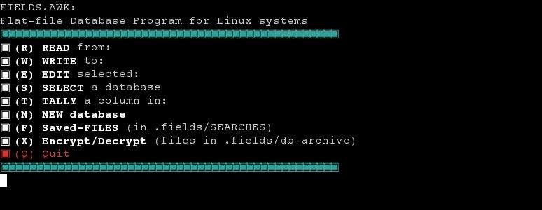 Fields.awk allows users to create and work with small-to-medium databases on their home computers or a mobile device with bash shell terminal emulator. It runs on any OS compatible with bash shell, including Linux, FreeBSD, MacOSX, and Android.