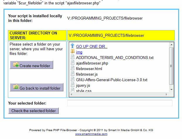 The Free PHP File-Browser is an open-source AJAX/PHP project, which you can use in your projects. With the file-browser, your users can select a certain folder on the web-server, e. g. an installation-folder.