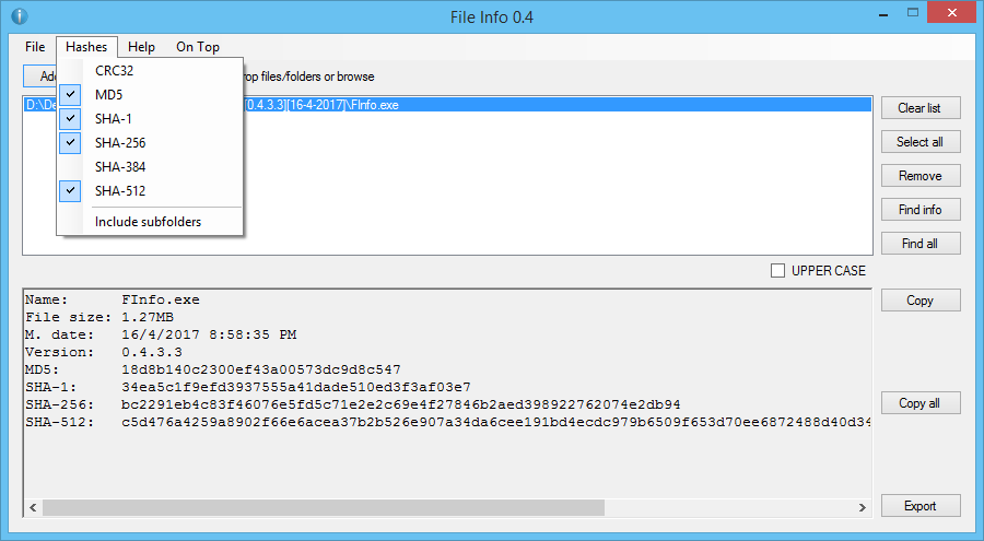File Info is software that gives you information about your file(s) like CRC32, MD5, SHA-1, SHA-256, SHA-384, SHA-512, and other file info.