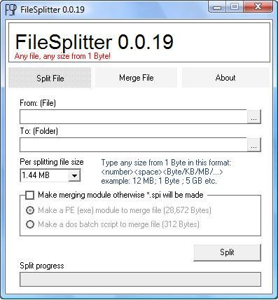Use this software to split & merge any file at any size (from 1Byte) that user have to type in "Per splitting file size" combo-box in this format: <number><space><Byte/KB/MB/GB> example: 12 MB; 1 Byte ; 5 GB etc. [Visual Basic 6.0]