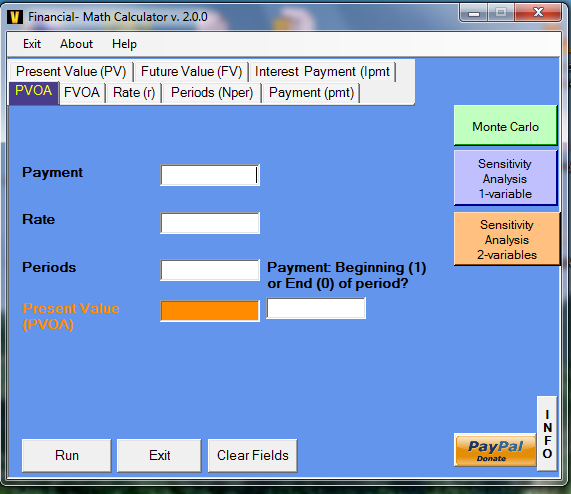 Moreover, you can determine the ‘Present Value Of an Annuity’ (PVOA) as well as the ‘Future Value Of an Annuity’ (FVOA), simply by inputting the data into the indicated fields and clicking on the ‘Run’ button to receive the corresponding results.